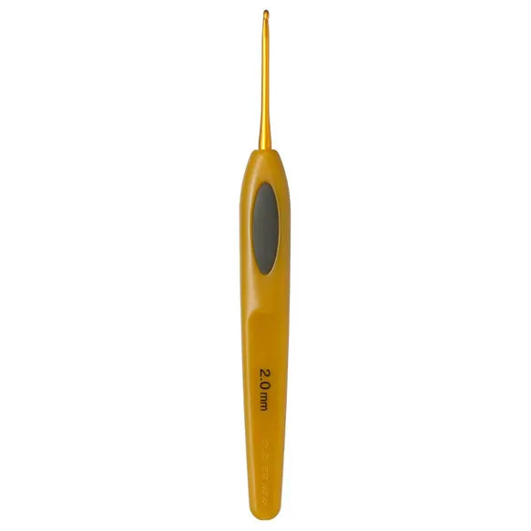 De haaknaalden hebben een stijlvolle goudkleurige afwerking met een zwarte duimsteun, en de naalddikte is duidelijk op het handvat vermeld. Verkrijgbaar met een aluminium haakpunt in de maten 2.00–6.00 mm en met een stalen haakpunt in de maten 0.50–1.75 mm.