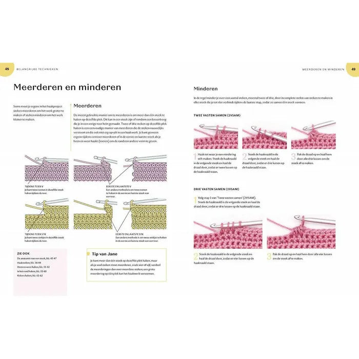 Door het hele boek heen vind je de rubriek ‘Tip van Jane’, waarin auteur Jane Crowfoot haar waardevolle adviezen en praktische tips deelt. Als gerenommeerde ontwerper en docent staat Jane bekend om haar heldere uitleg en toegankelijke stijl. Ze helpt je onder andere met het herstellen van fouten, het herkennen van de goede kant van je werk, het voorkomen van uitrekken van garen en geeft zelfs specifieke tips voor linkshandige hakers.